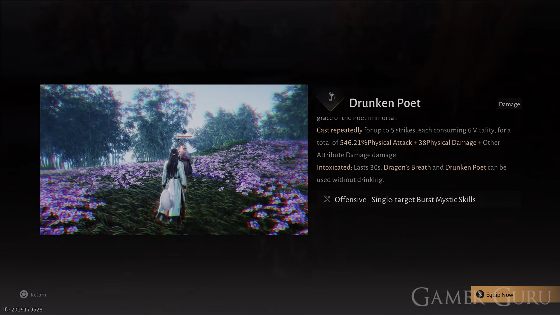 Drunken Poet (Tier 4): Drink deeply to enter the Intoxicated state, imitating the drunken grace of the Poet Immortal. Cast repeatedly for up to 5 strikes, each consuming 6 Vitality. Intoxicated lasts 30 seconds. Drunken Poet can be used without drinking once Intoxicated. Pre-drink before using Dragon's Breath, and spam Drunken Poet when you are low on endurance, and Soaring Spin is on cooldown, especially if the boss is burning and you still have Heavenquaker Spear buff active. Drunken Poet turns burn into explosive bonus damage.