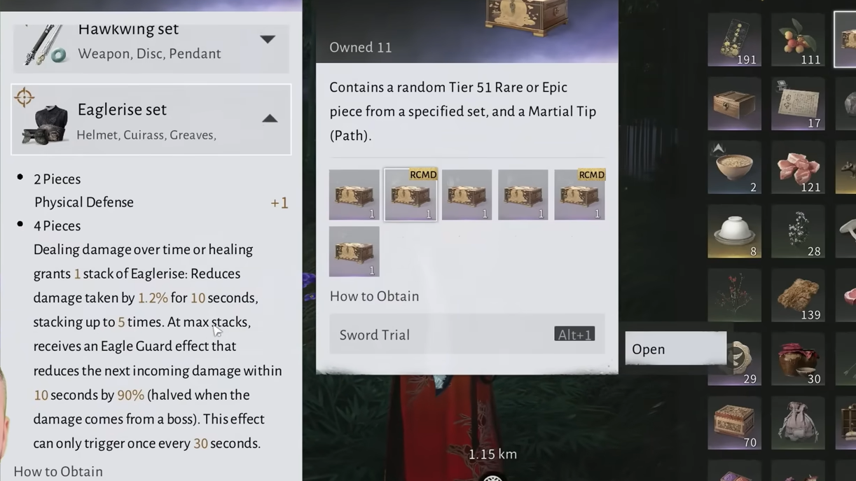 The Hawkwing Set increases Affinity Rate with 2 pieces. With 4 pieces, when any of your damage triggers Affinity, you gain Hawkwing: Increases Physical Attack by 2% for 5 seconds, stacking up to 5 times. This set provides the most value due to high affinity bonuses, helping you deal more damage with the amount of hits you inflict. The build's DoT nature means you often fight high HP enemies before bursting them with bleed's amplified DoT effect, letting you capitalize on the damage bonus even more. Hawkwing pieces can be obtained from the Still Shore campaign, Gleaming Abyss campaign, Sword Trial, and Group Dungeon.