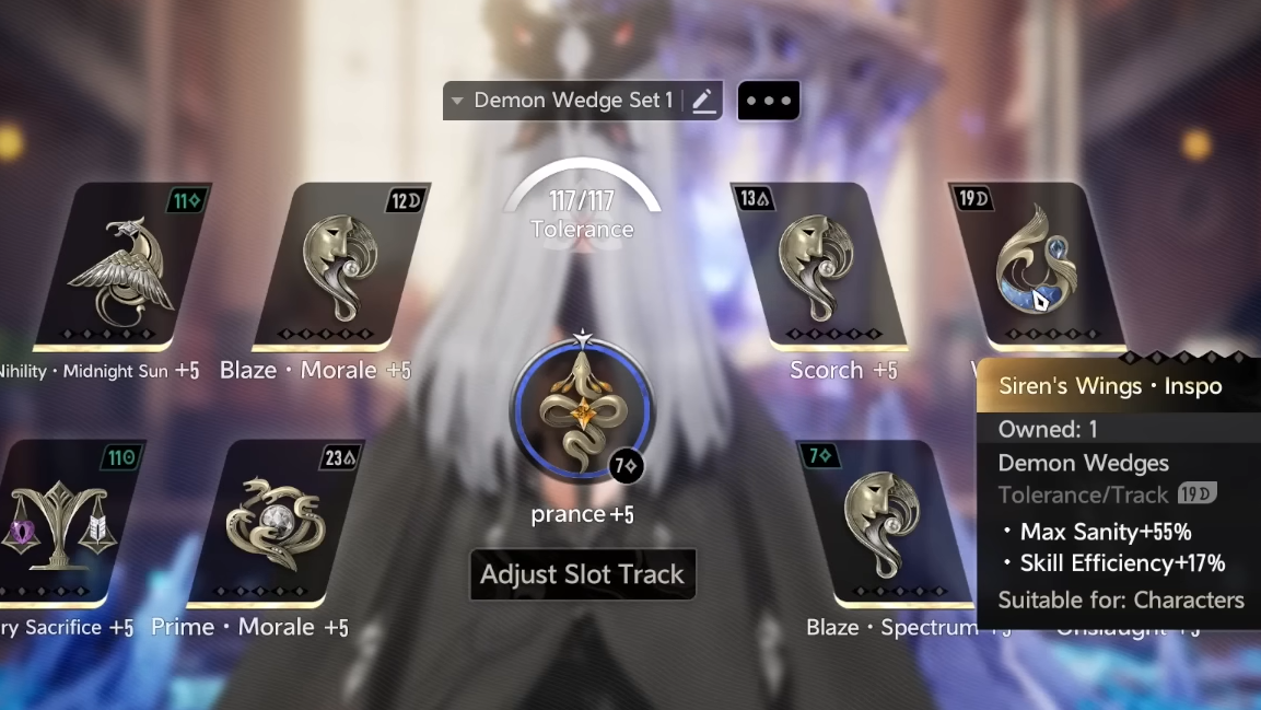 | Demon Wedge loadout | Prime · Uplift, Prime · Uplift, Illusionary Sacrifice, Duel, Wings, Blaze · Morale, Blaze, Onslaught | Stacks Skill DMG, Umbro scaling, ATK, and crit to match her damage profile. |