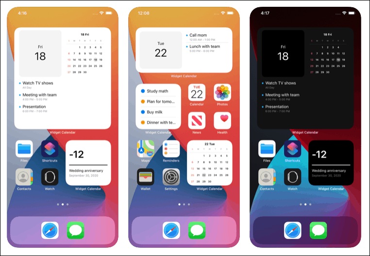 It supports all three sizes of widgets, and you can stack the same-sized calendar, reminder, and D-Day widgets to save up space on your screen if you like. The app also supports the dark mode. You can buy the app for a one-time fee of $1.99 from the App Store.
