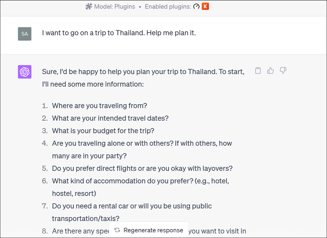 The goal is to communicate your needs effectively to the plugin. State your purpose and requests clearly. And, of course, when in doubt, let plugins like Kayak or Trip.com take the wheel, which will ask you questions and force you to provide more details.