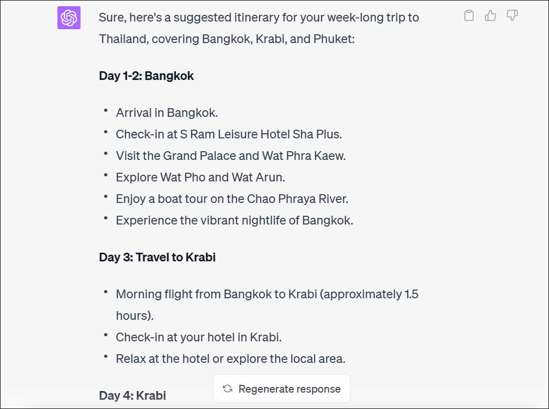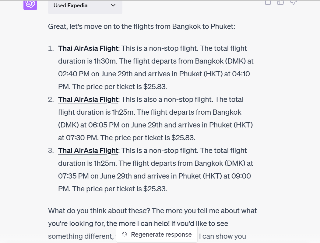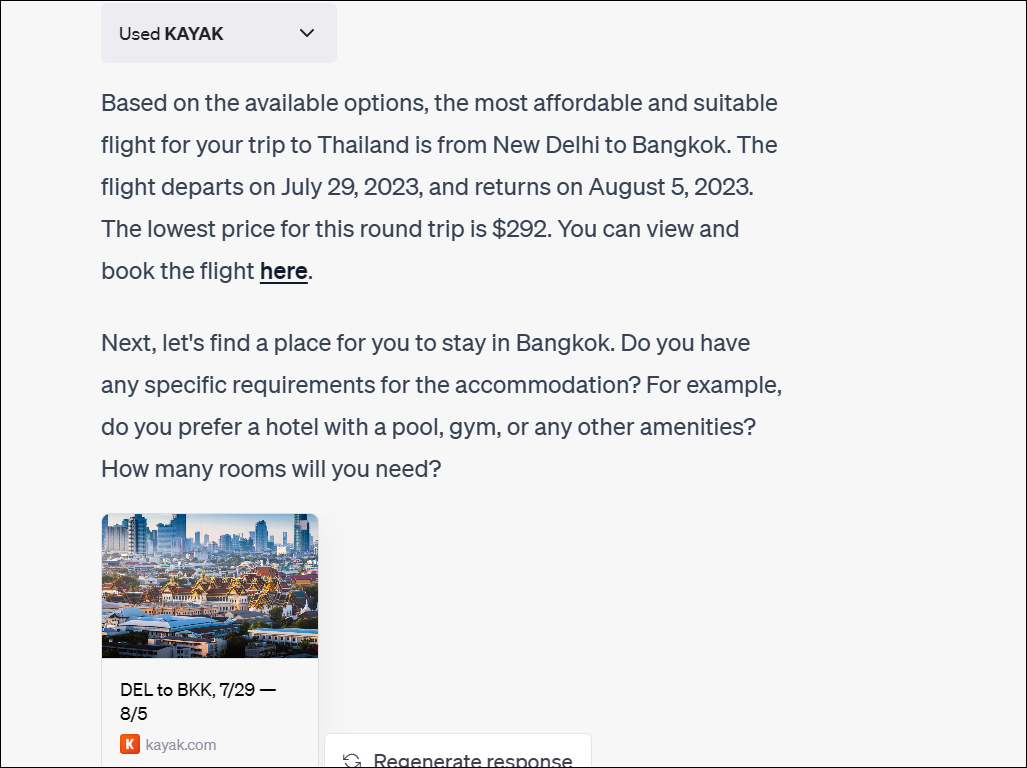 Similar to Kayak, I again provided it with a vague request outlining nothing else but my destination. And it went on and asked me about my preferences similar to Kayak. In addition to the city I'd be traveling from and my flight and hotel preferences, it also asked me about the cities in Thailand I'd like to visit.