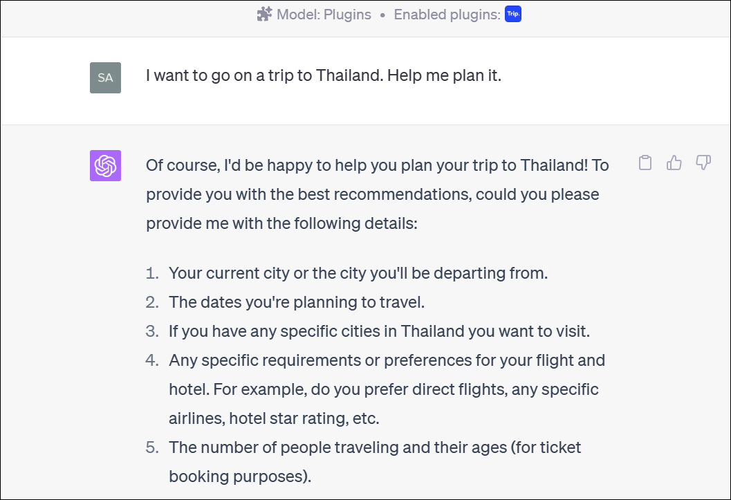 I provided it with a rather vague request for help planning a trip to Thailand. With no other information, it kicked into action and presented me with the list of things it needed to know to help me to the best of its abilities.