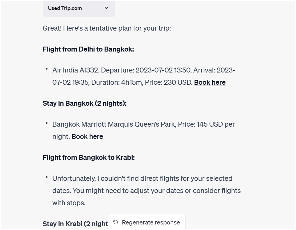 But when you do give it information to work with, it works! From hotels to flights to activities to rental cars, it can whip up the entire itinerary for you. Just remember to be proactive with your prompts and provide it information to work with. Otherwise, you'll be wasting your time. Like Trip.com, it provides booking links you can directly book. Also, it provided more practical and affordable options.