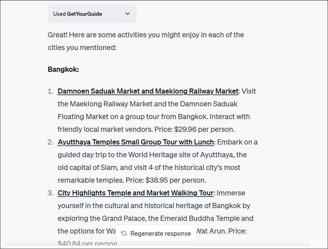 In all the cases above, the itineraries they created were similar (I instructed Kayak to accommodate my preferred cities myself, even if it didn't ask). However, if you want something different in terms of activities and experiences, the GetYourGuide plugin should be on your Installed list without a doubt.