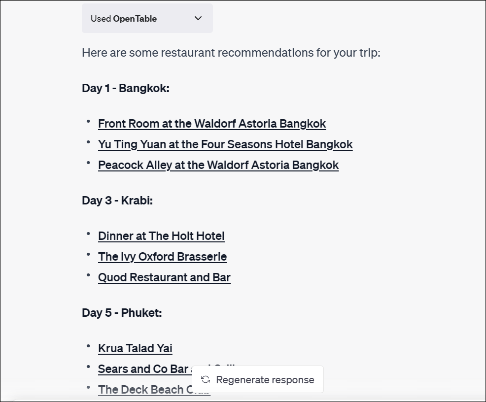 ChatGPT allows you to use three plugins at a time. My advice would be to use one of the planning plugins from Kayak, Trip.com, and Expedia, with GetYourGuide and OpenTable, for the most optimum experience.