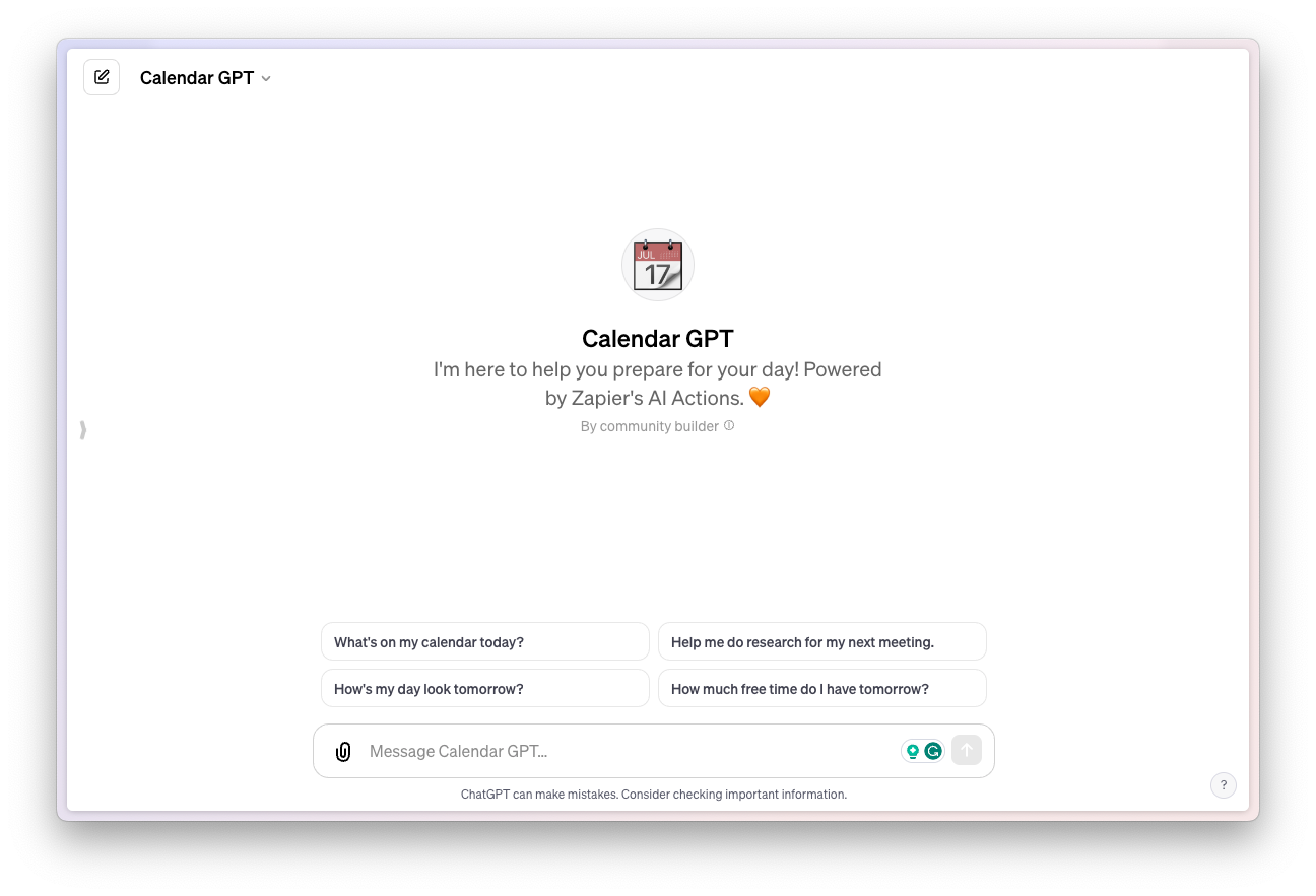 Using Zapier Actions, Calendar GPT can connect to your calendar and help you prepare for your day. You can ask it questions about your schedule in English as if you're conversing with a personal assistant, and you'll get personalized responses. For instance, it can tell you how much free time you have on a particular day, what upcoming meetings you have (and even help you research for them), what appointments you have coming up, etc. You'll need to sign into your Zapier account to use it, though.