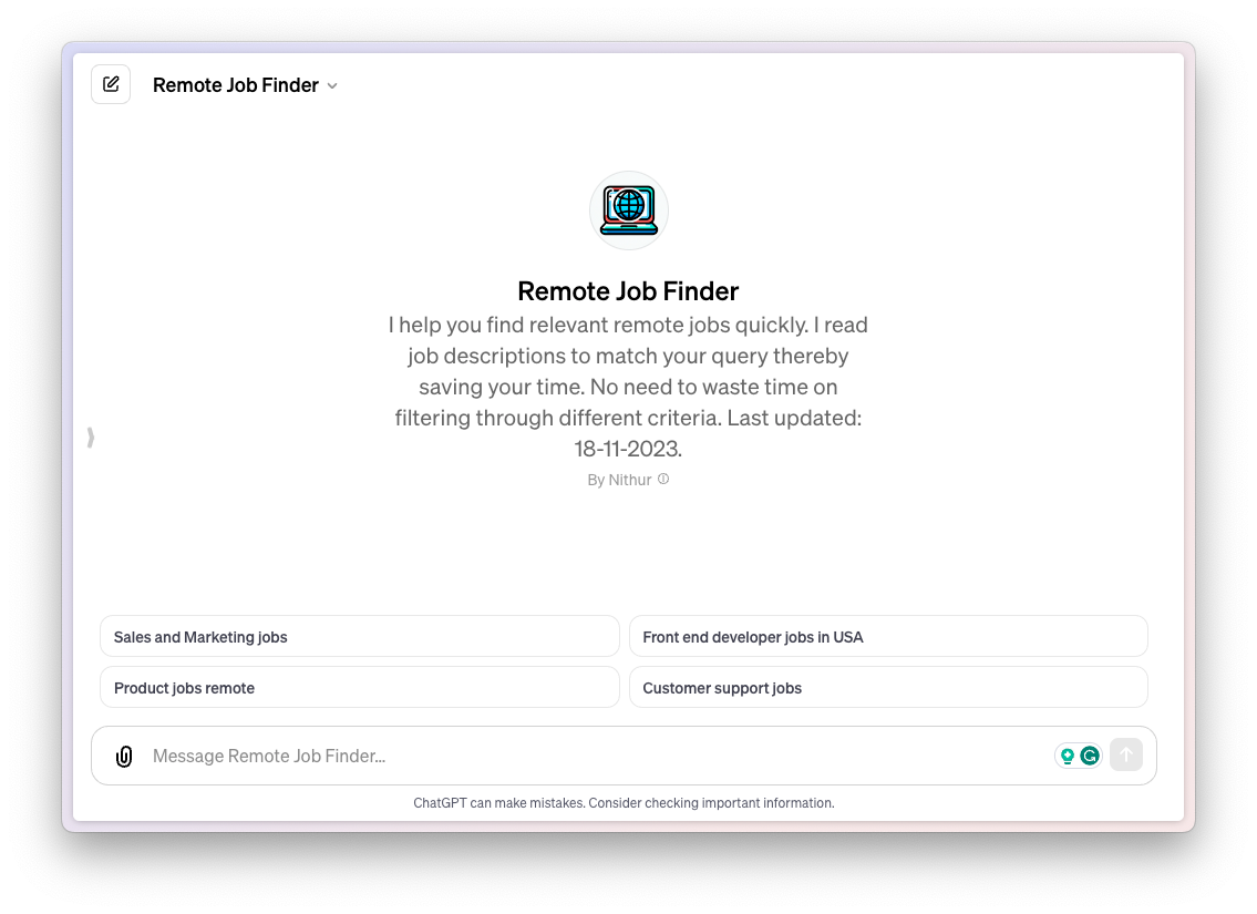 This GPT goes through the job descriptions and returns results that match your query so you can dedicate your time to landing the right remote job instead of wasting time finding it.