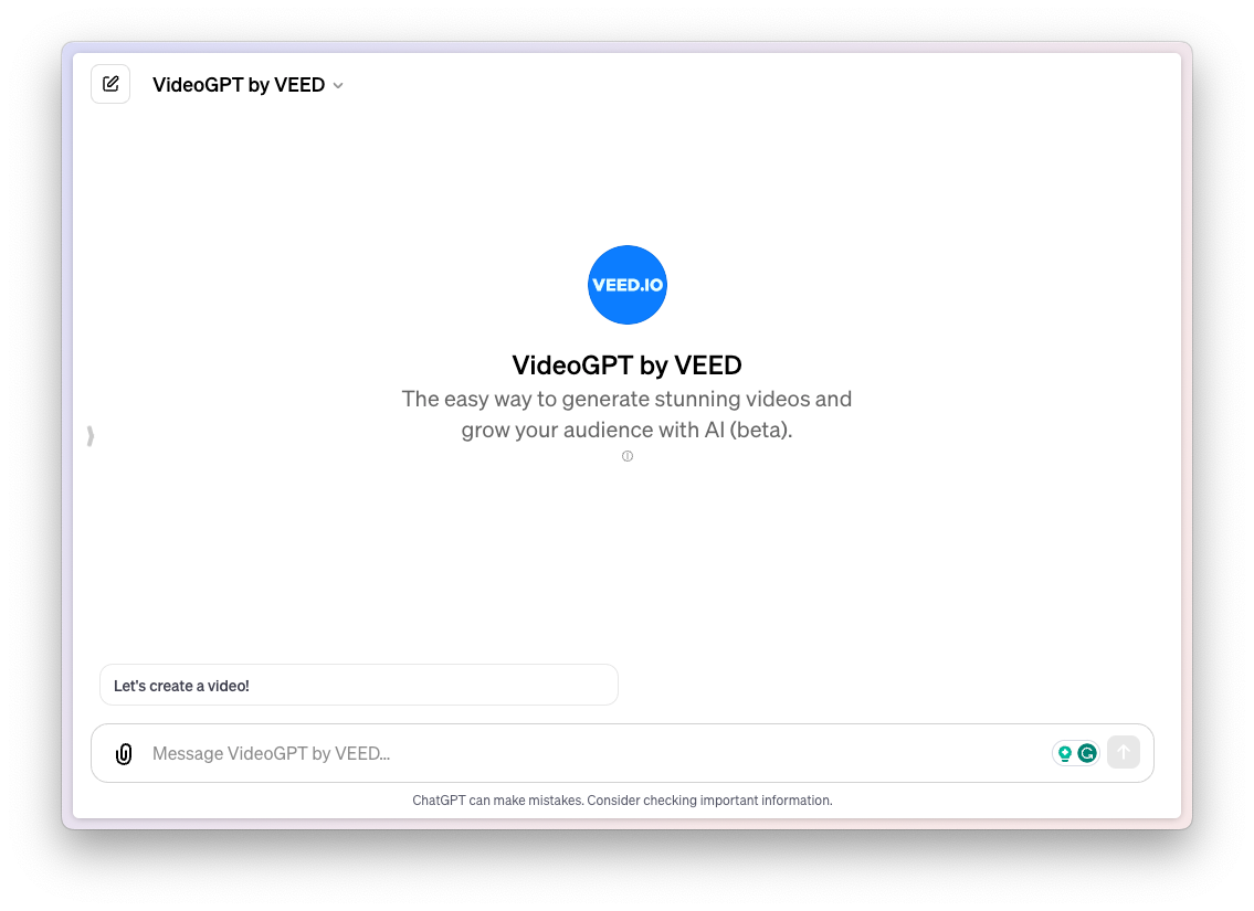 This GPT uses Veed to create stunning videos for you using AI. All you need to do is answer a few questions about the type of video you want to generate and then sit back as the AI does its work.
