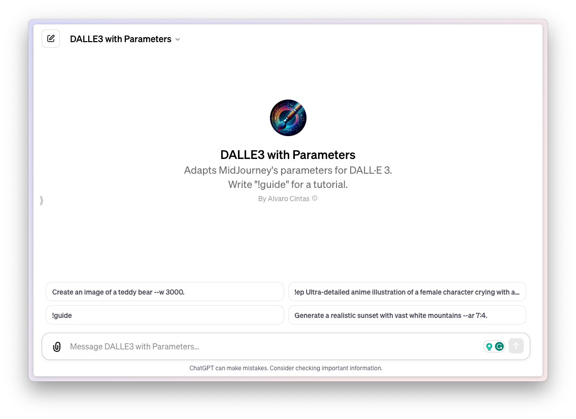 With this GPT, DALLE 3 in ChatGPT adapts Midjourney parameters – one of the greatest things about the platform. You can choose the aspect ratio, stylization, seeds, weirdness, & more for your creations with DALLE 3 with this GPT.