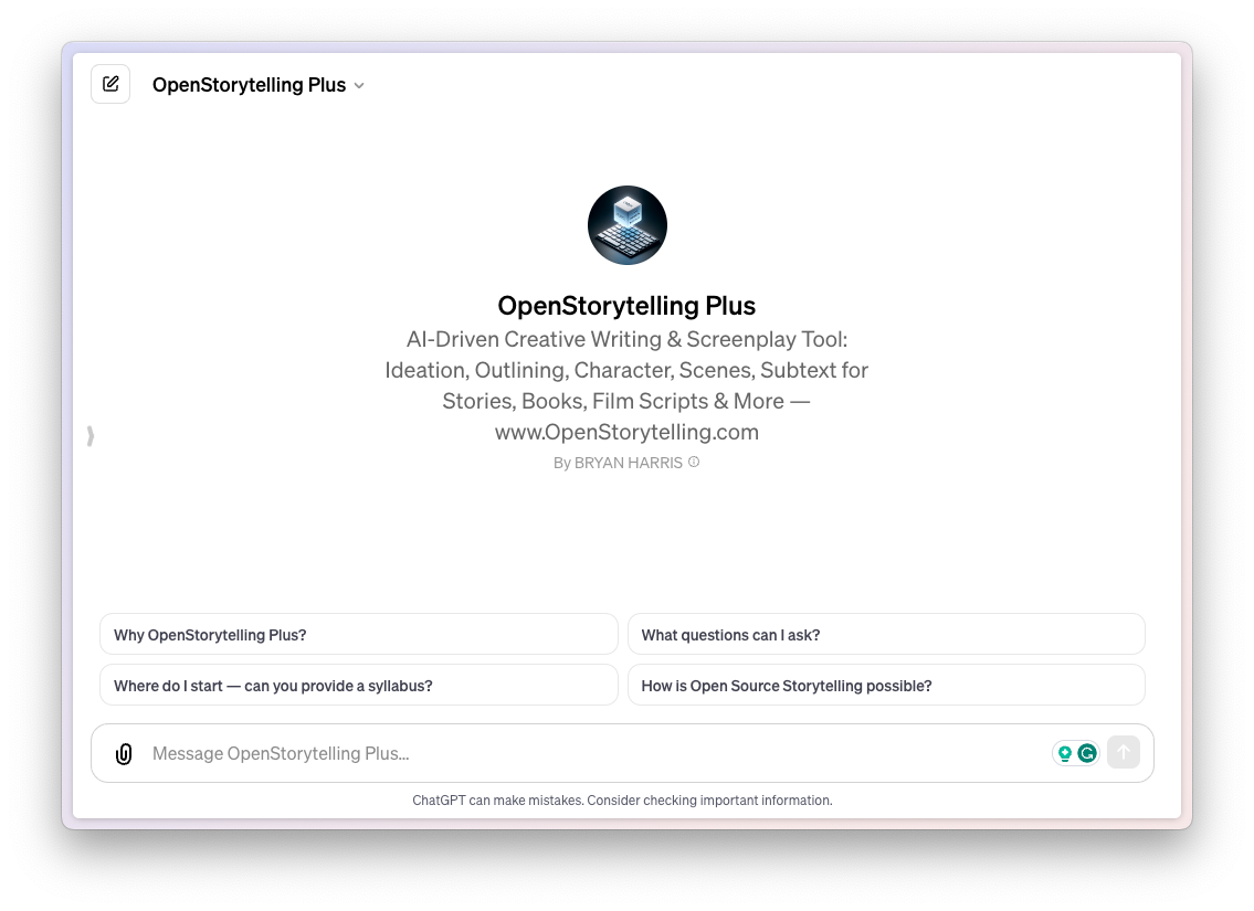 For all you writers and screenwriters out there, OpenStorytelling Plus is a great GPT to have in your arsenal. It can help you with ideation, outlining, and developing characters, scenes, and subtext for stories, books, and scripts.