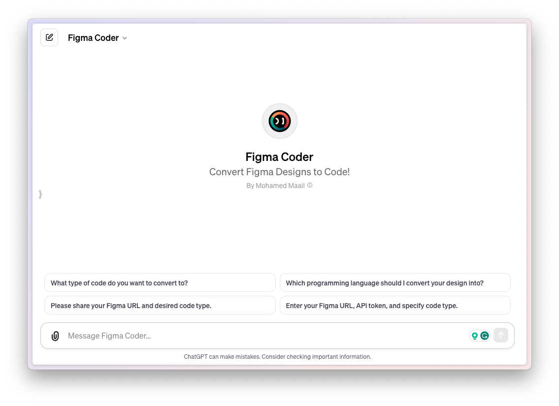 Using this GPT, you can effortlessly turn your Figma designs into codes in whichever language you desire. All you need to do is provide it with the Figma URL and instruct it about the language you want the code in, and it'll get to work.
