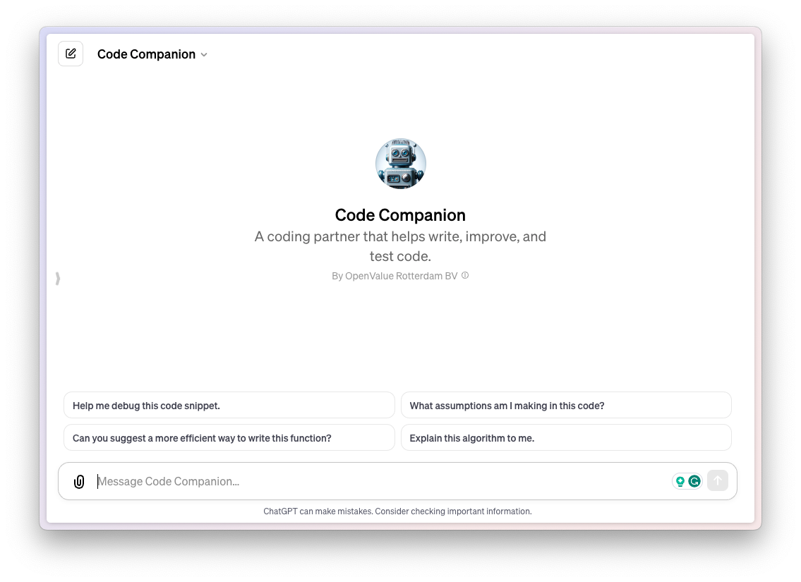 Code Companion can help you debug your code, explain any assumptions you're making, make your code more efficient, explain algorithms to you, and much more. If you are looking to improve your coding (who isn't?), give this GPT a try.