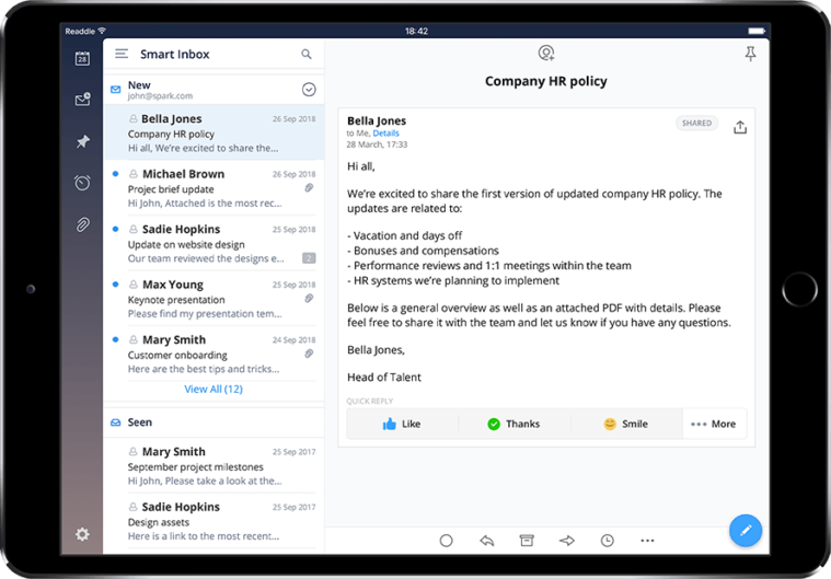 However, Spark Mail is only available for Mac, Android, iPhone, and iPad as of now. It will soon be a cross-platform app for Windows and the Web. To stay tuned with Spark’s updates, send them your e-mail address.
