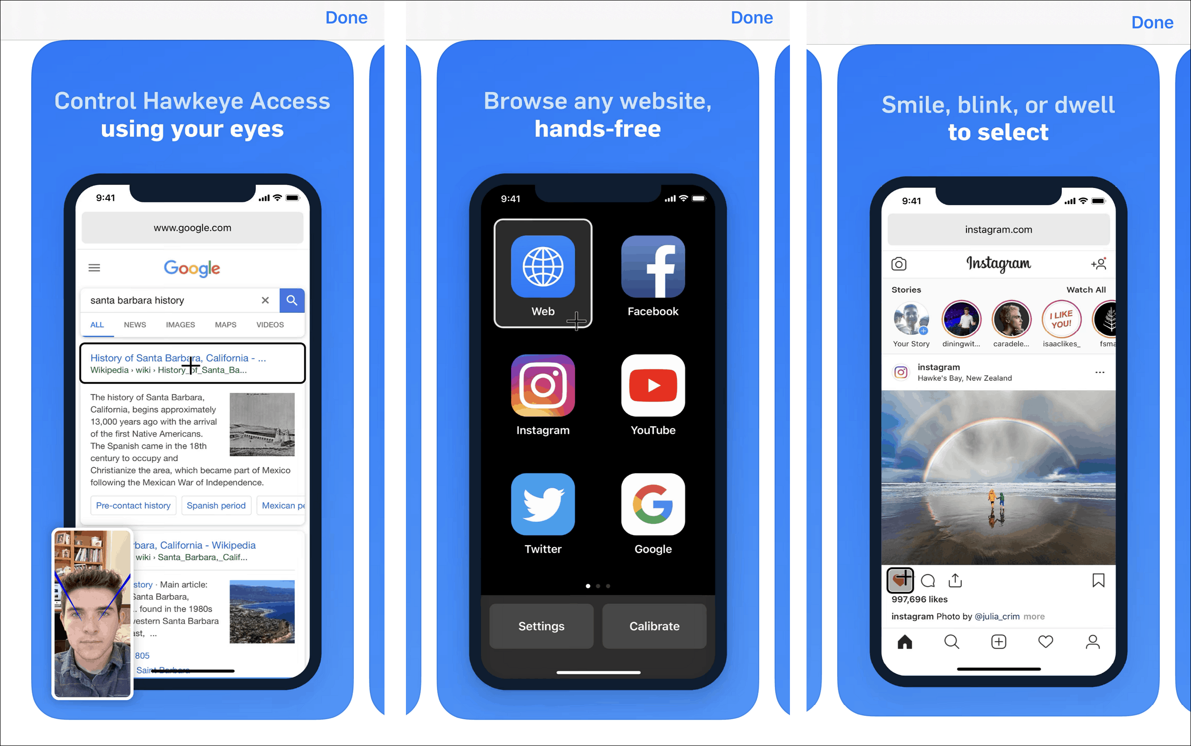Hawkeye Access is an eye control web browser. Yes, you heard us right. An eye control web browser. It uses the TrueDepth camera of your iPhone, so it will only work with the newer models like iPhone X, XR, XS, 11, 11 Pro. It lets you browse any website hands-free, entirely through eye movements. You can use expressions like smiling, blinking, or dwelling to select. You can customize which expression to use for selection based on what suits you the best.