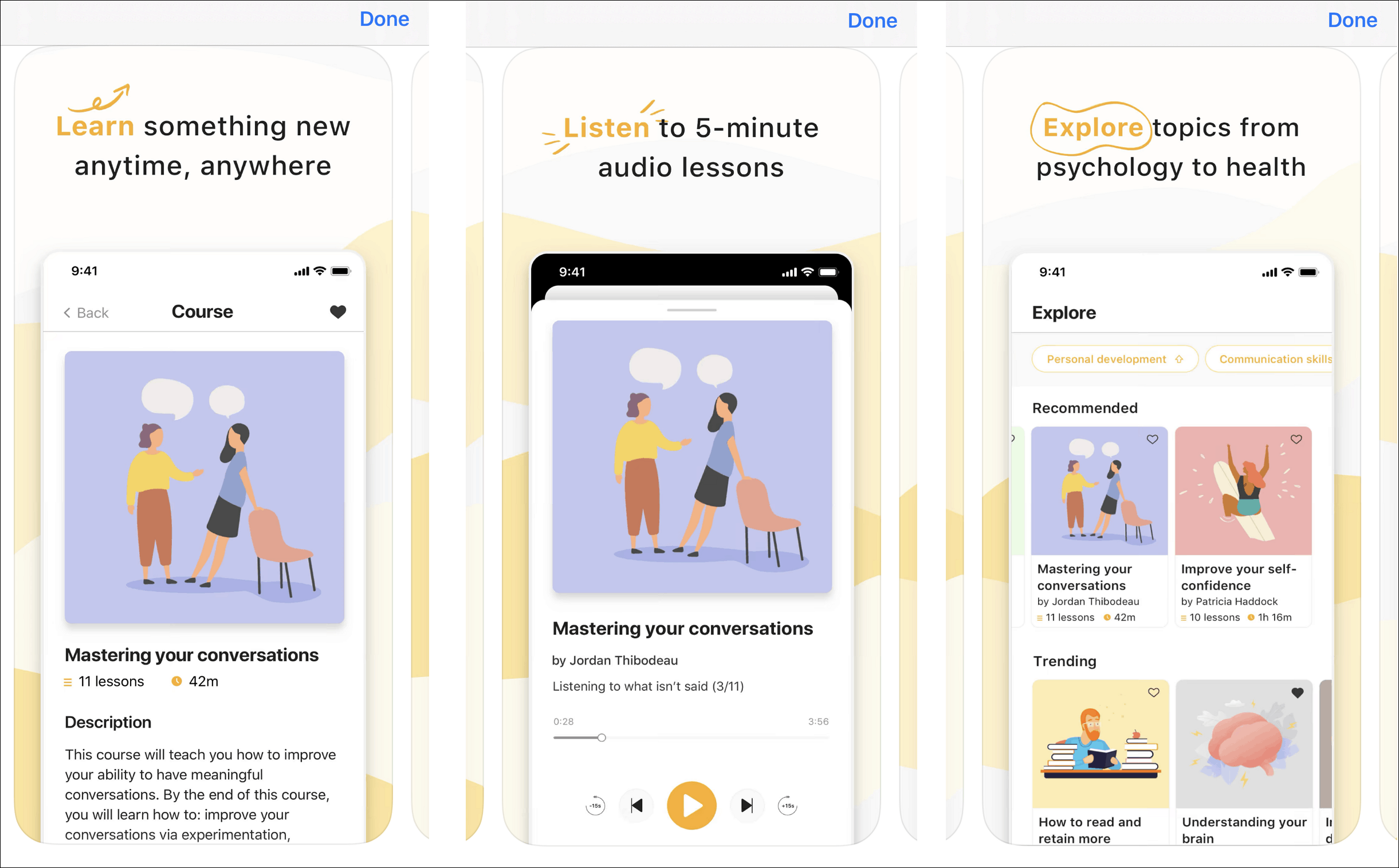 Time is money. And this app lets you save time by learning something new while you are doing something else. It provides 5-minute audio lessons that you can easily listen to while commuting, running or doing housework. You can choose from topics ranging from Psychology, Career and Personal Development to Health and Philosophy. New courses are also being added each day.