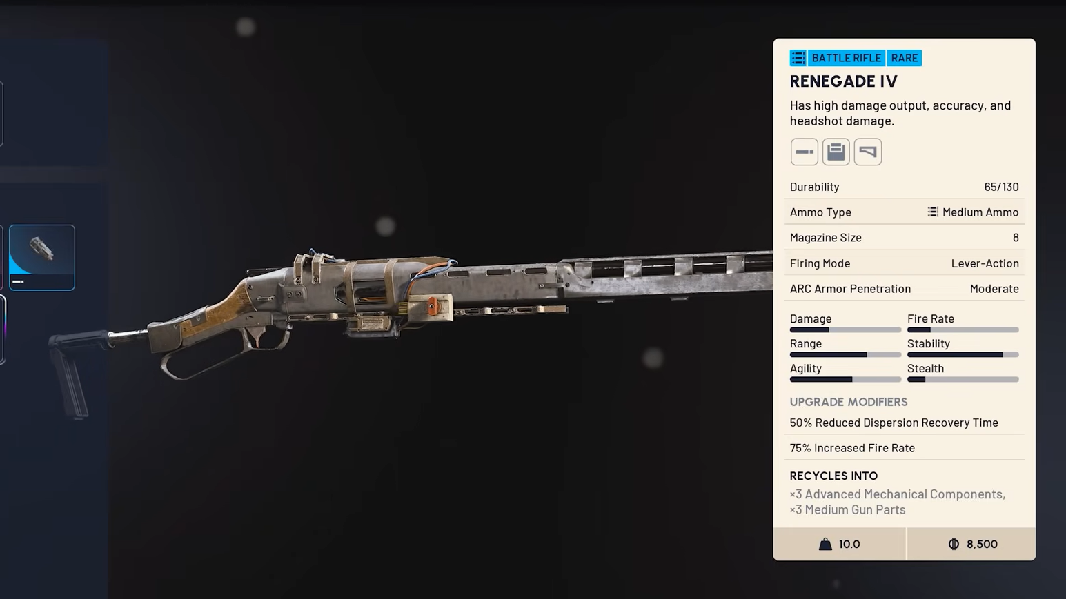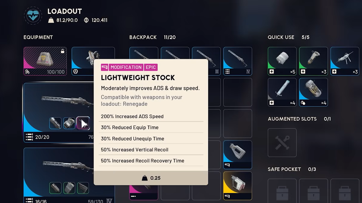 The Renegade's biggest weakness is dispersion recovery, or how long the crosshair takes to tighten back up after each shot. Because it fires fast for a semi-auto, pulling the trigger before the reticle resets causes shots to drift wide, even when the aim point is perfect. Stocks are the only slot that directly shortens that window.