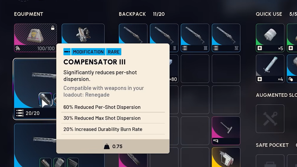 Stable Stock II cuts recoil and dispersion recovery time by 35% with no downsides to equip speed, which is why it shows up in nearly every budget Renegade loadout. Stable Stock III pushes that to 50%, but adds 20% increased equip and unequip time, which matters if the Renegade is a backup weapon you need to pull out in a hurry.