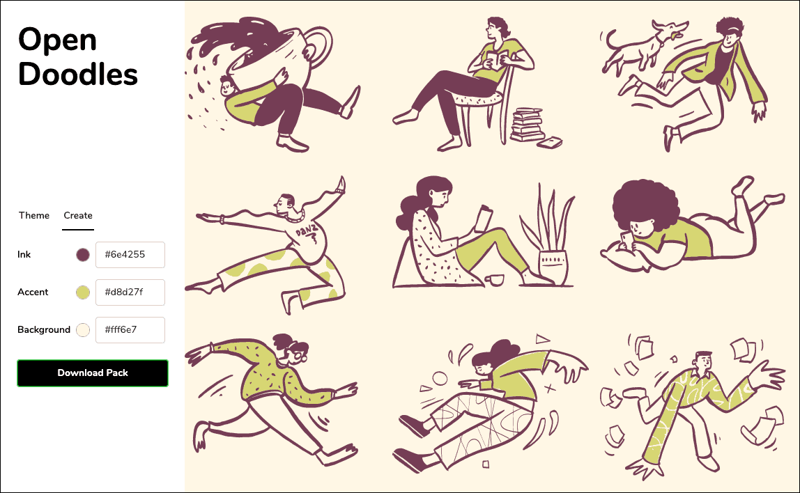Opendoodles is also an illustration generator! You can add your own spectrum of colors to a pre-designed gallery. If you wish, you can download individual cartoons, or the entire library/pack too.