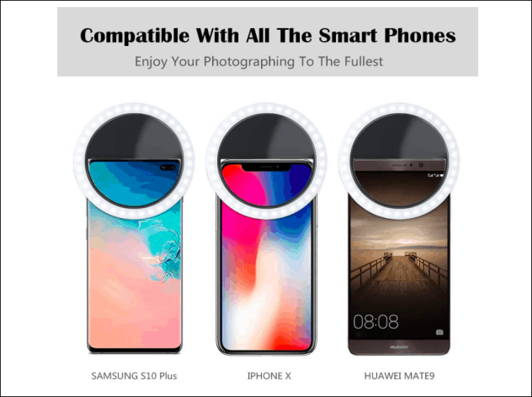 This selfie light ring is a USB-powered vanity light ring clip-on that can be used on your phone, laptop, tablet, and even desktop. It is supported by a rechargeable battery via the USB connection. Cushioned with silicone gel, this light ring comes in three lighting modes, which are three levels of white brightness. It is designed for both android and iPhones.