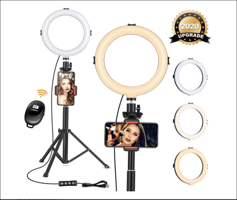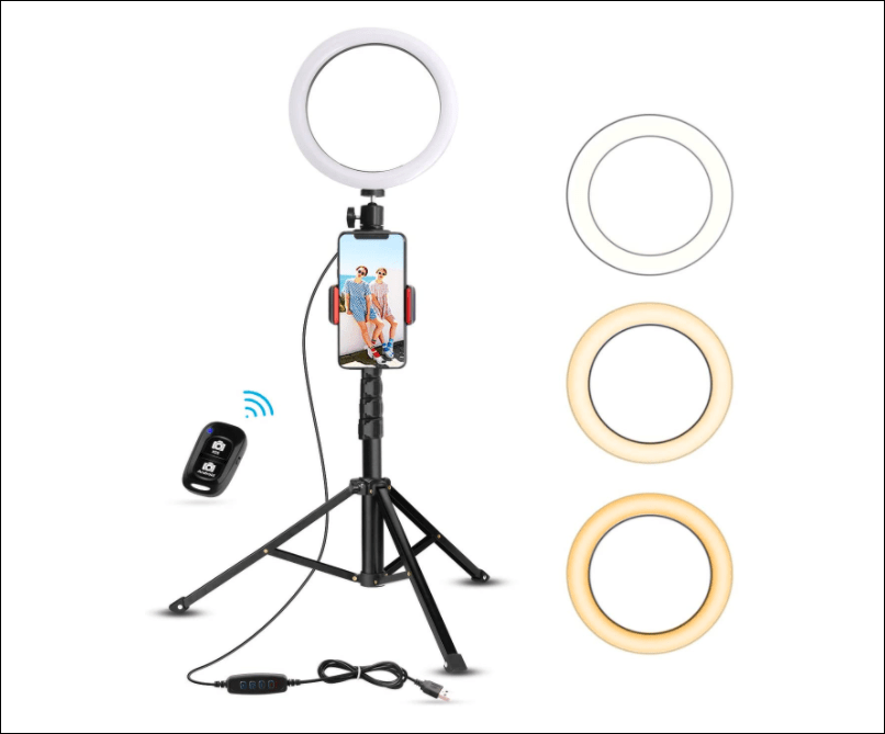 This is a dual-purpose product. You can use this as a light ring with its adjustable tripod set for your meetings and also as a selfie stick. There are three kinds of lighting modes with 10 levels of brightness levels each. You can change the brightness level according to the need. Erligpowht light ring comes with a phone holder, a phone clip, a tripod and an adapter among other essentials.