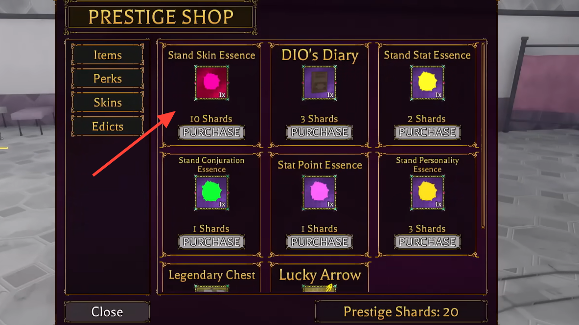 | Stand Skin Essence | Applies a skin to your current Stand | Prestige Shop, Robux Shop |