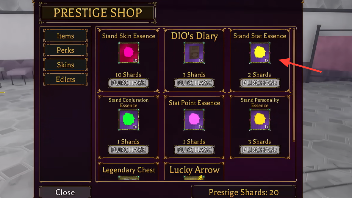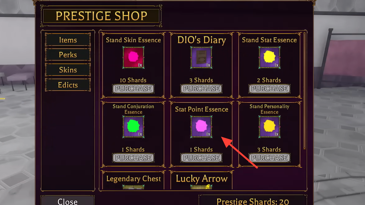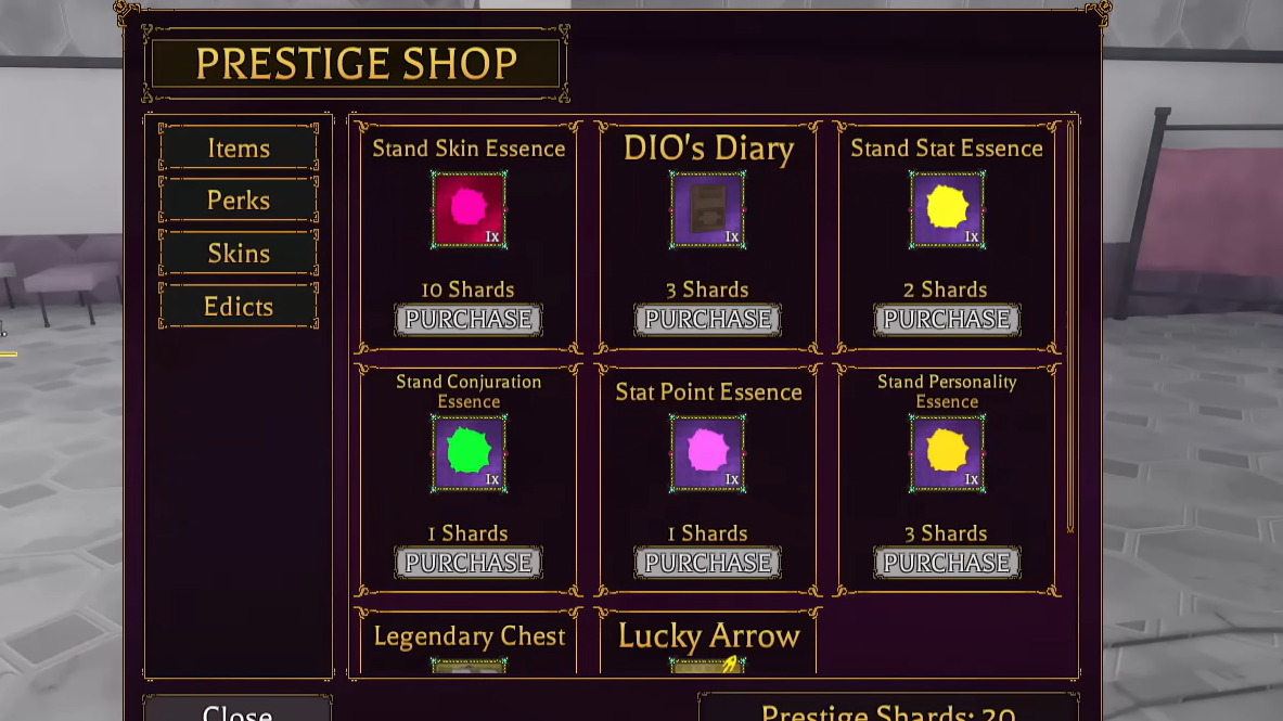 | Stand Stat Essence | Rerolls your Stand’s stat grades | Prestige Shop, Robux Shop, Gang Shop |