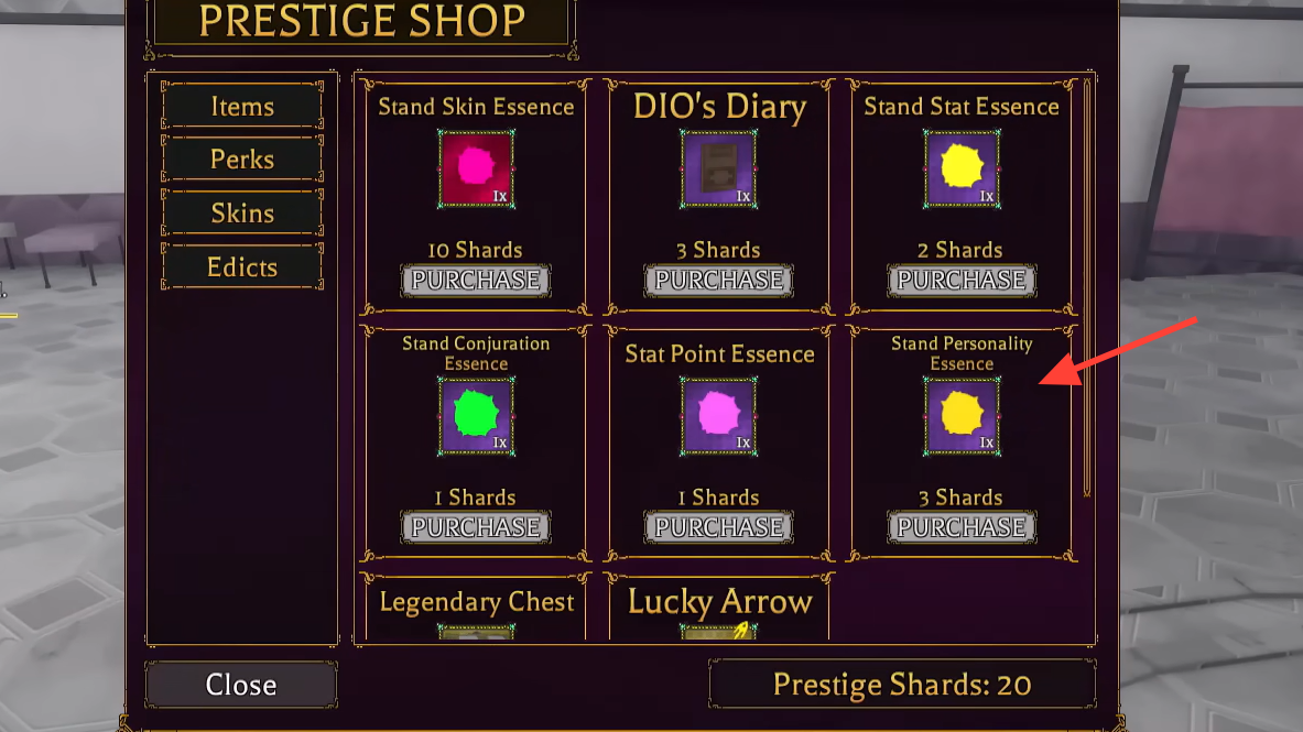 | Stand Personality Essence | Rerolls your Stand’s personality | Prestige Shop, Robux Shop, Gang Shop |