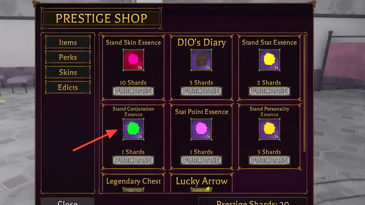 | Stand Conjuration Essence | Maxes the Conjuration level of your current Stand | Prestige Shop, Rahaj’s Shop, Robux Shop, Gang Shop |