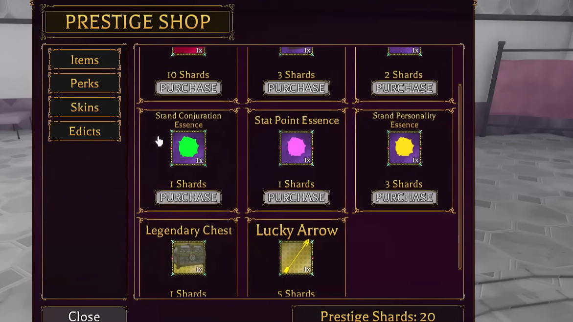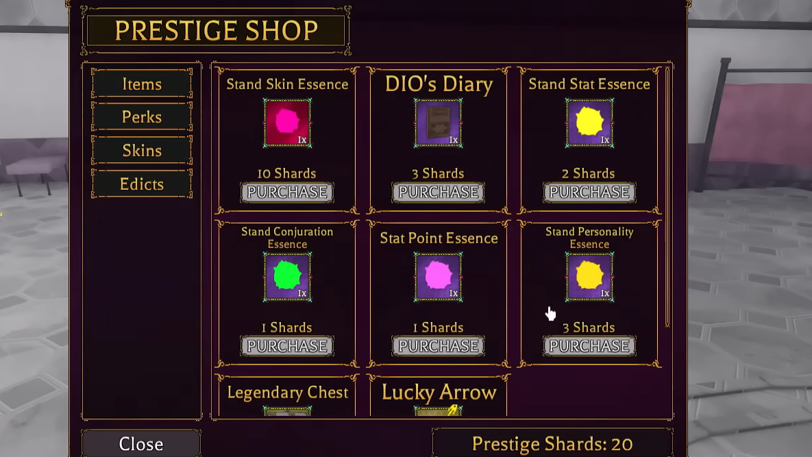 | Stand Stat Essence | Rerolls your Stand’s stat grades | Prestige Shop, Robux Shop, and Gang Shop |