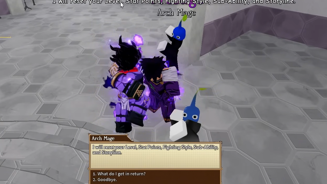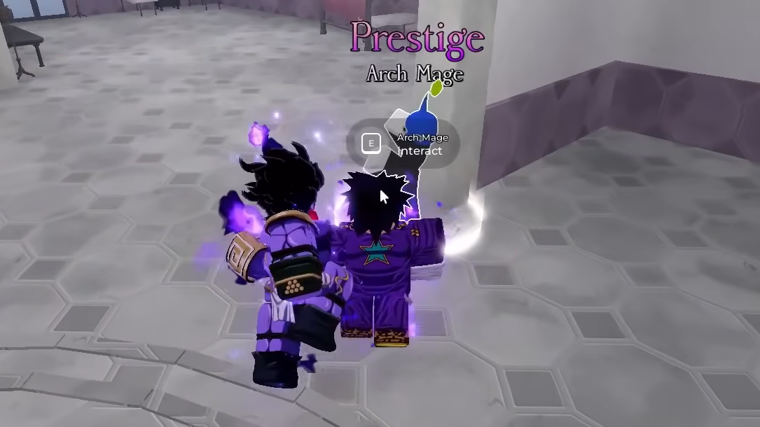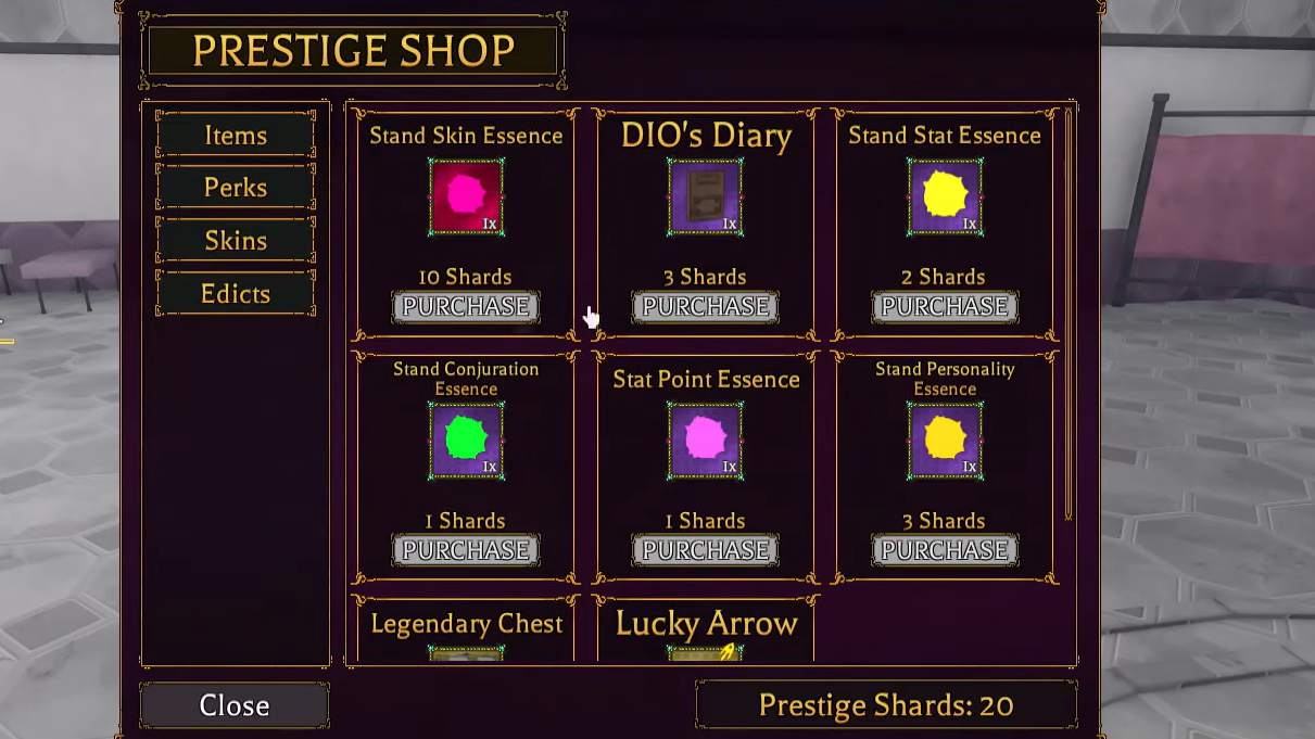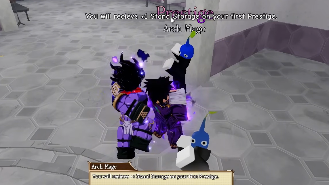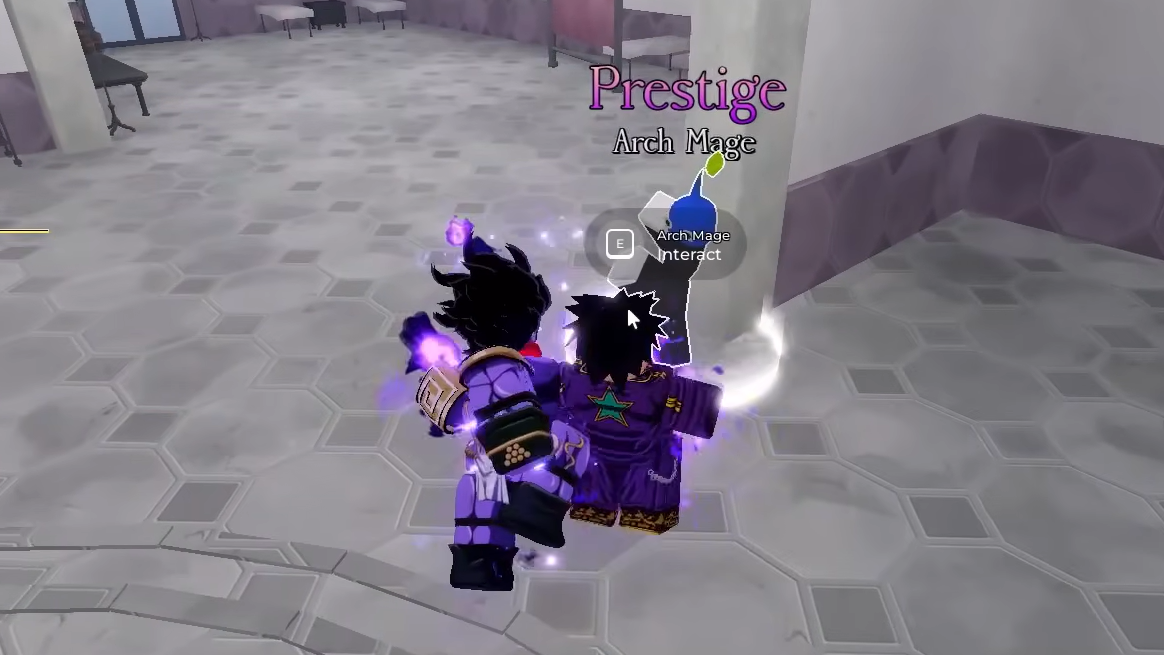 The Arch Mage doubles as the Prestige Shop vendor. You can spend your Prestige Shards here on items, perks, skins, and upgrades that are unavailable anywhere else in the game. The skin rolls are particularly noteworthy because winning a skin also grants you the associated Stand for free — rolling the High Voltage skin, for example, gives you The World: High Voltage.