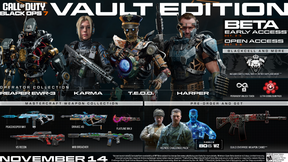 One timing note: Vault Edition cosmetics aren’t usable during the Black Ops 7 Beta. They go live in Multiplayer on November 14 and become available in Call of Duty: Warzone starting in Season 01.