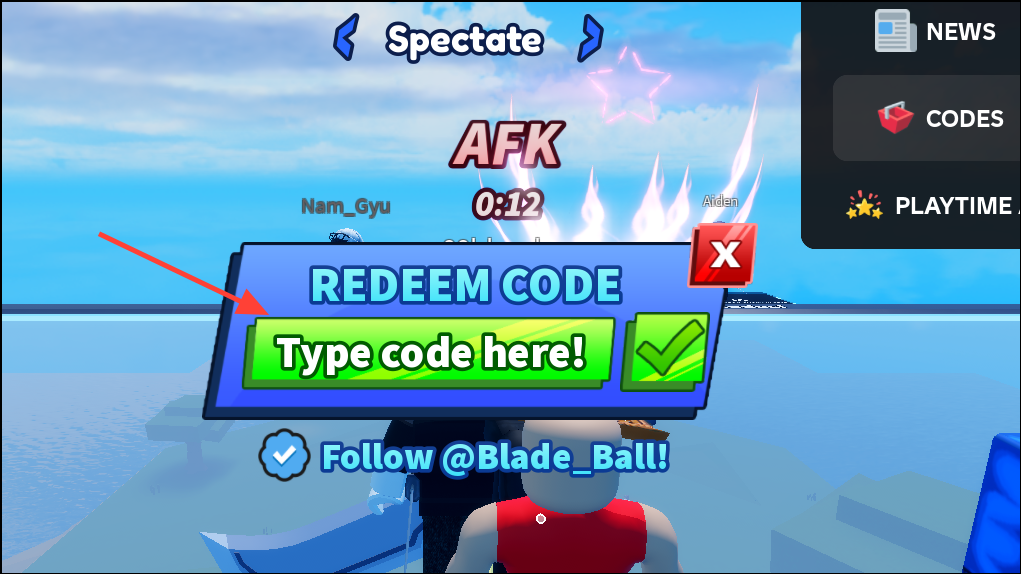 Step 4: Paste a working code exactly as shown, then press the green checkmark to redeem.