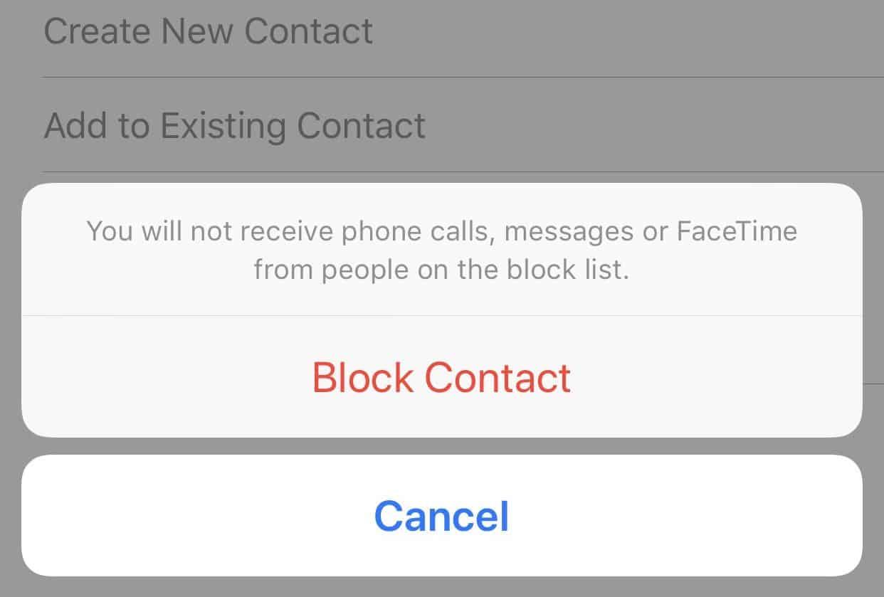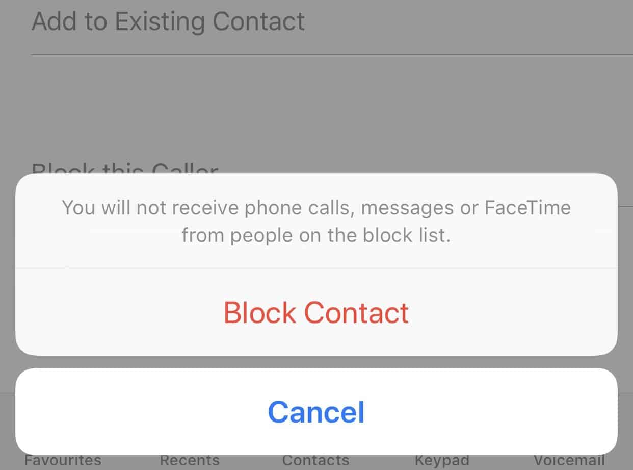 - You will get a pop-up informing you that you will not receive any communication from the blocked numbers. Tap the button which says Block Contact in red.
