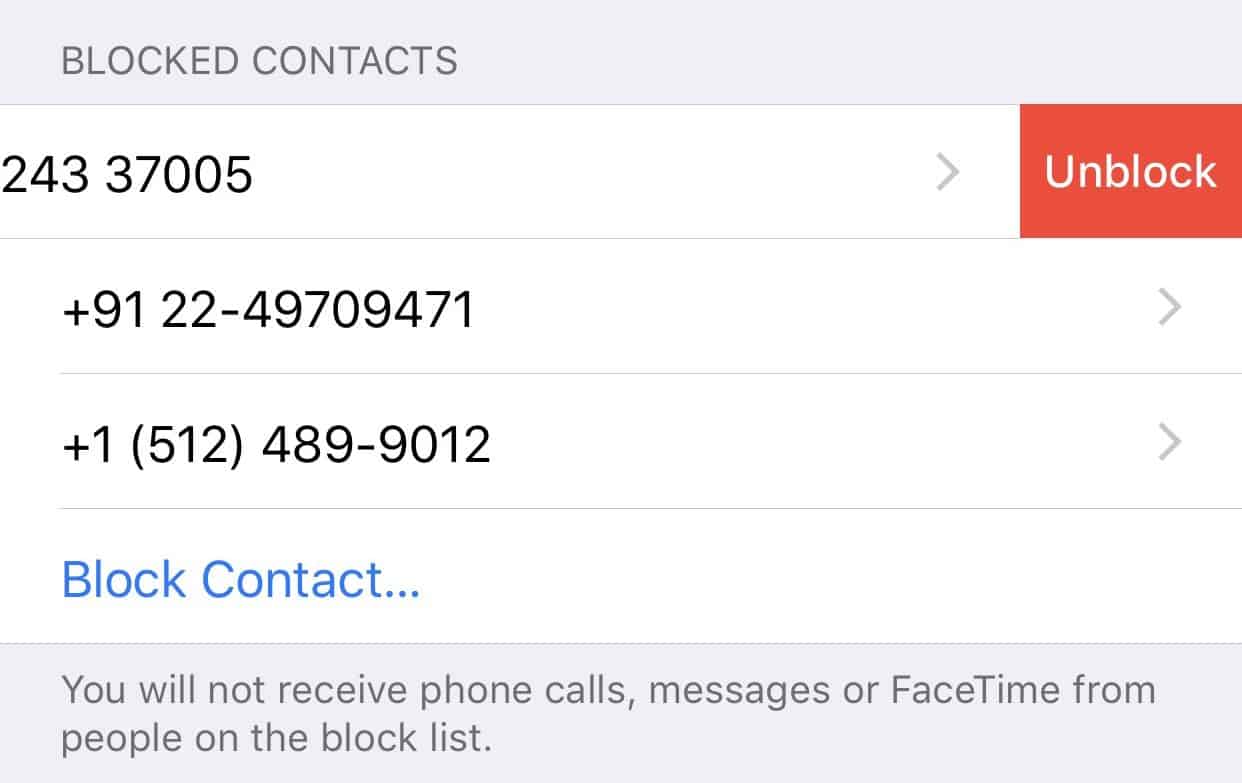 - Here you will see a list of all the numbers that you have blocked on your iPhone. Swipe left on the number you want to unblock. This will reveal an Unblock button, tap on it.
