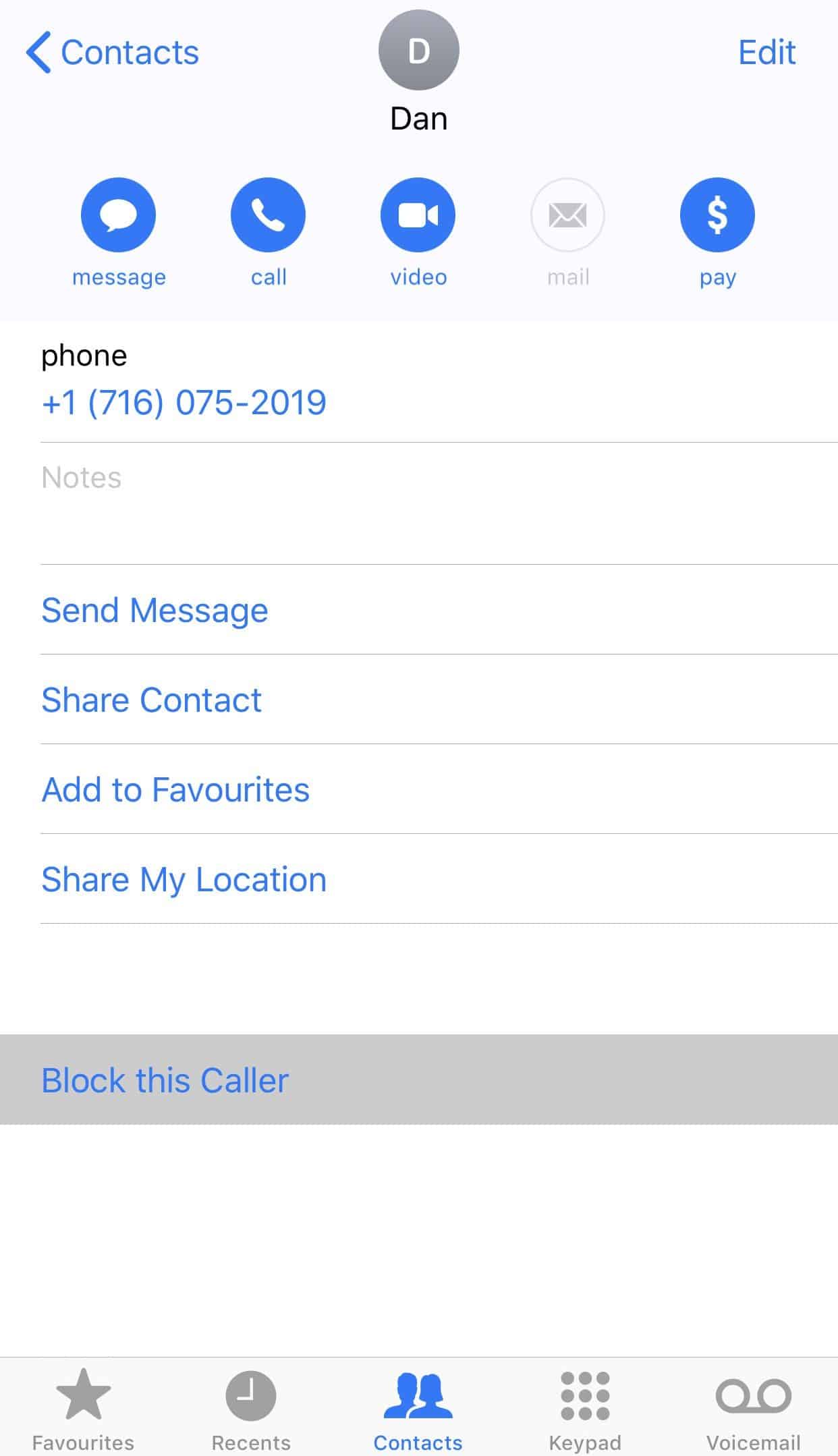 - On the contact detail page, scroll to the bottom and tap Block this Caller.