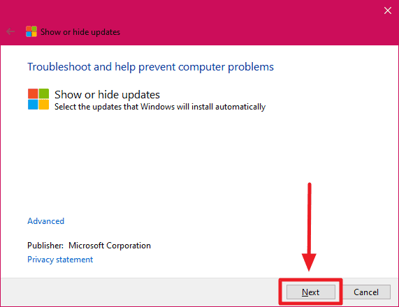 Double-click/run the wushowhide.diagcab file on your computer. It’ll open a Windows 10 troubleshooter window to show or hide updates from appearing in Windows 10 updates section. Click the Next button.