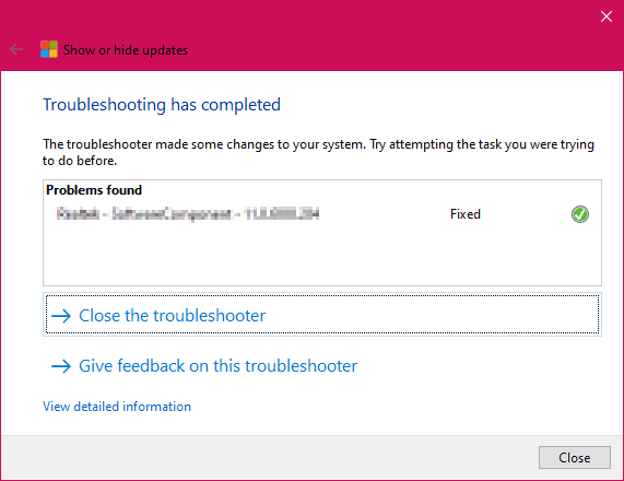 After selecting the KB4524244 update, click the Next button to proceed. The troubleshooter will then try to resolve the problem by blocking the update on your system. If it succeeds, you should see the following screen.