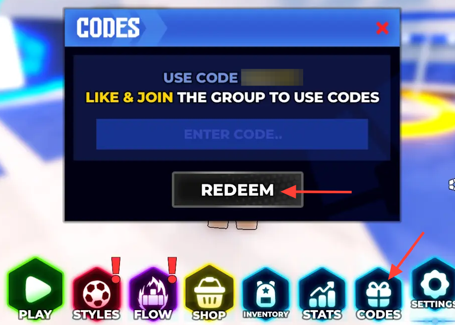 Step 3: From the lobby, select the Codes icon at the bottom menu to open the redemption window.