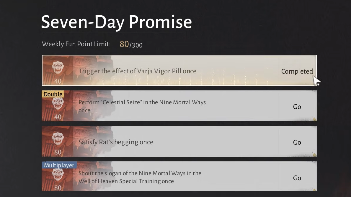 Perform Celestial Seize in the Nine Mortal Ways once: Use the Celestial Seize mystic skill to steal an item from any NPC within the Nine Mortal Ways Base. This grants 40 Fun Points.
