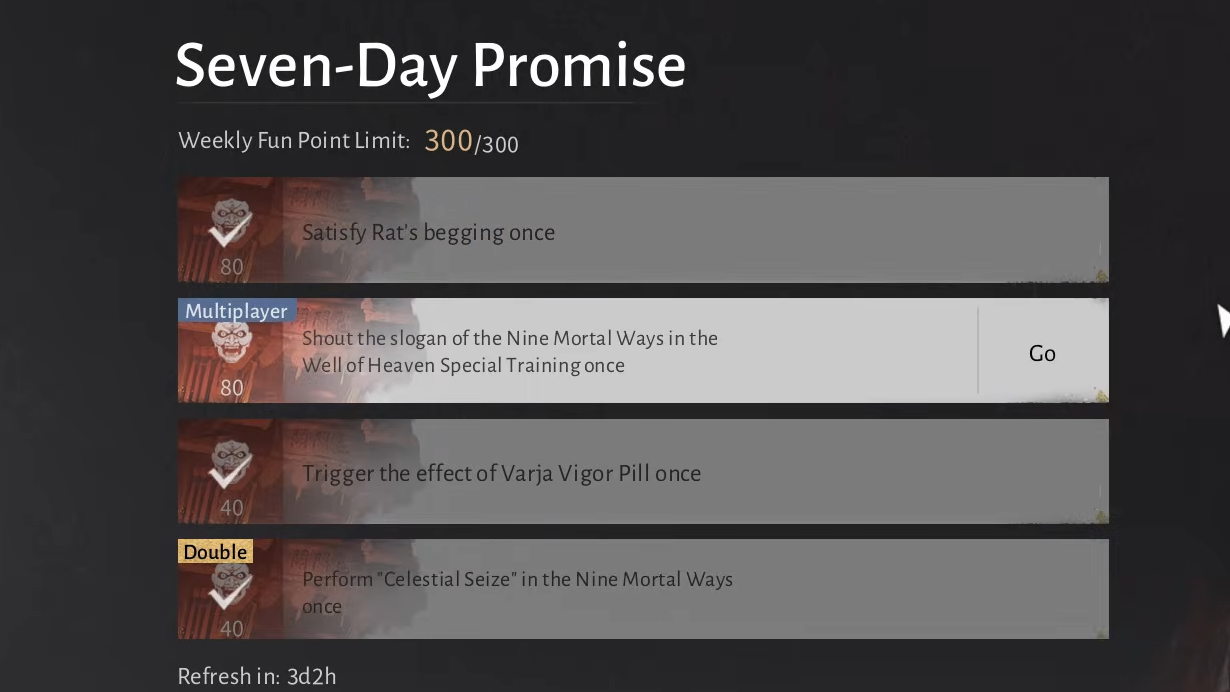 The Seven-Day Promise consists of five repeatable tasks that reset weekly. You can earn up to 300 Fun Points per week from these activities alone.