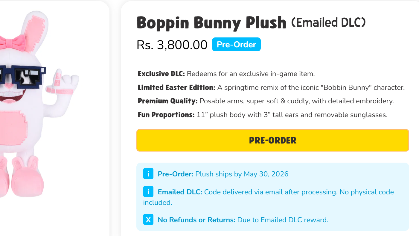 The physical plush ships by May 30, 2026. It features an 11-inch body with 3-inch tall ears, posable arms, detailed embroidery, and removable sunglasses — matching the in-game character's design.