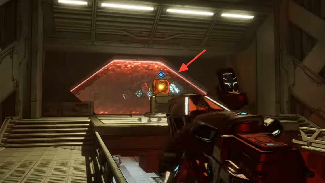 - Entrance: Shoot the visible power core on the left wall to drop the initial barrier.