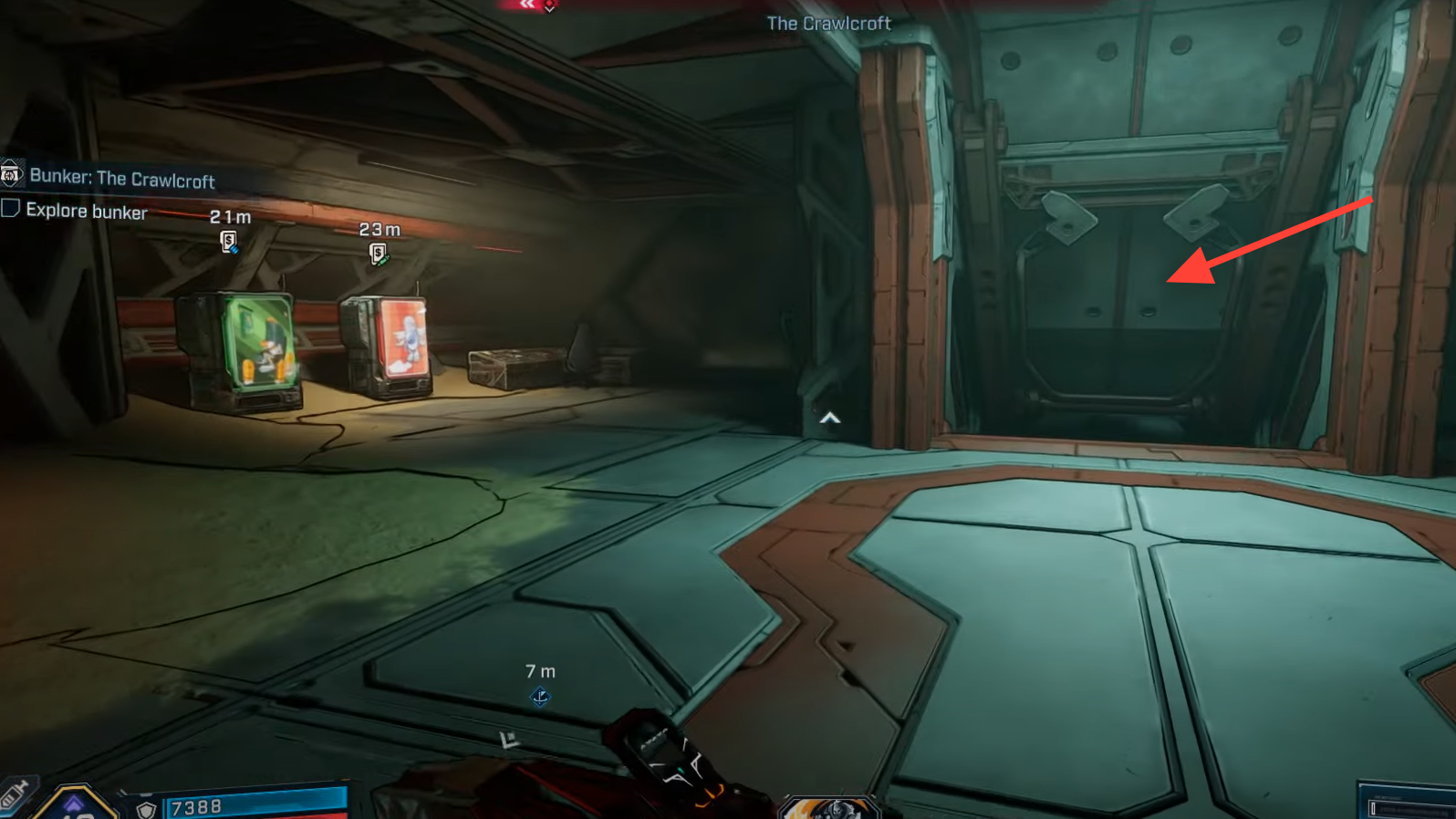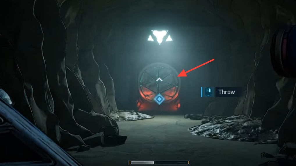 The bunker door is sealed behind shield plating. Grab a nearby Locust canister in the cave’s starting area and throw it at the plating to strip it and open the door.