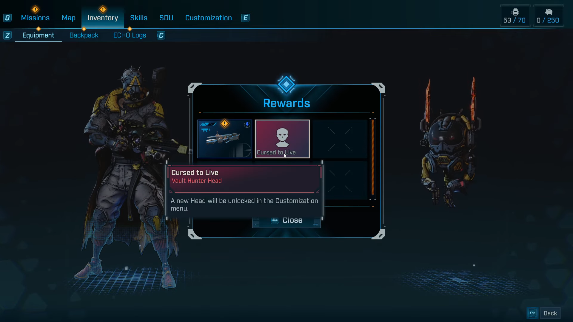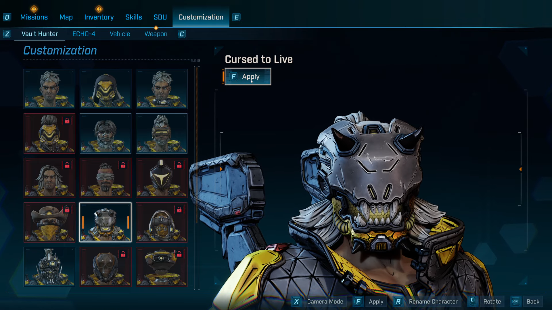 - Equip Cursed to Live from the Head customization slot.