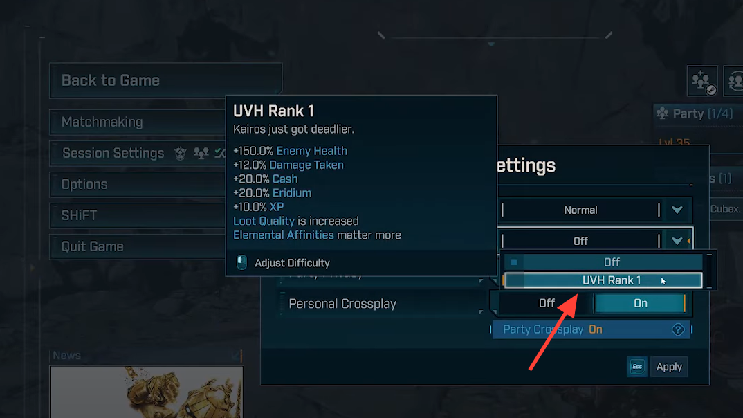 - Pause the game → Session Settings → set Ultimate Vault Hunter to 1.