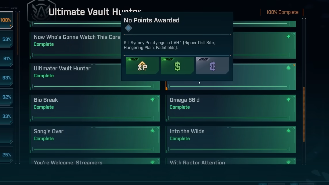 - Verify all four UVH 1 challenges are checked. Open Missions → Challenges → Ultimate Vault Hunter and confirm each UVH 1 entry is ticked. If anything’s missing, swap to UVH 1 and finish it, then talk to Lilith again.