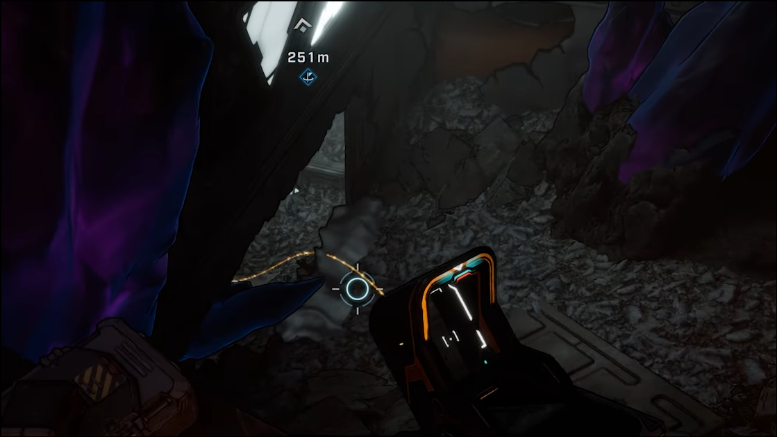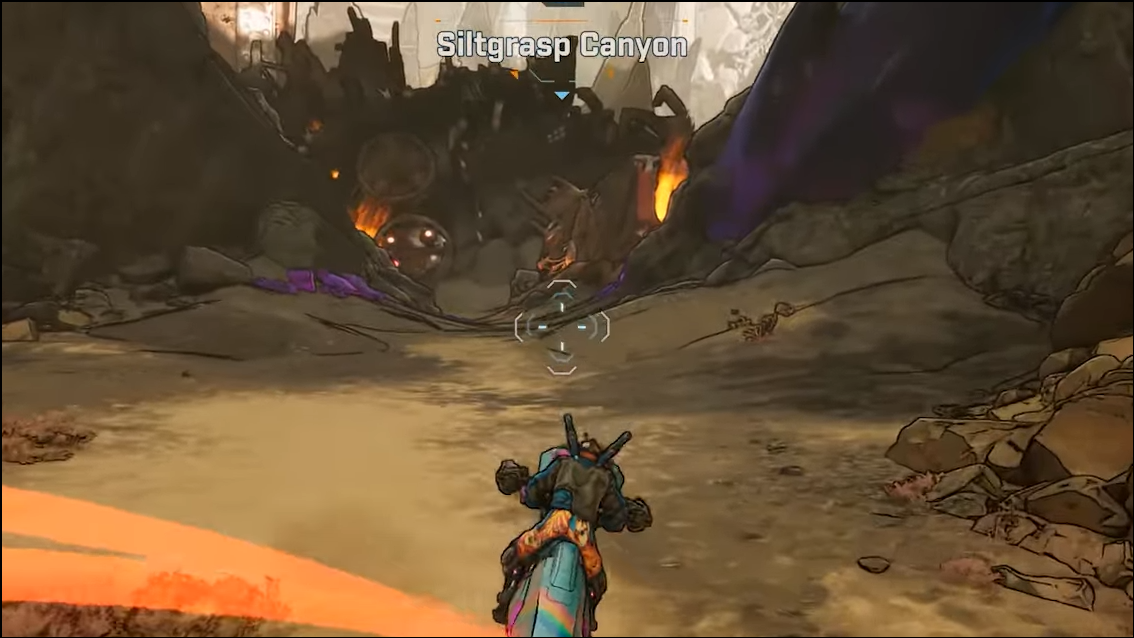Step 2: Enter Siltgrasp Canyon from the side of the main road in Lopside. On an unfogged map, this approach is marked by prominent purple Eridium crystal terrain.