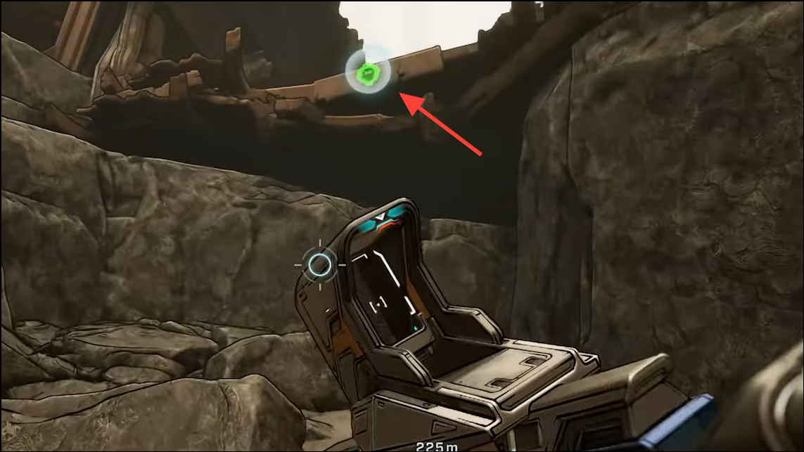 Step 3: Use the first grapple point inside the canyon to climb toward the wrecked structure ahead. Grappling is required here; there is no alternate ramp route.