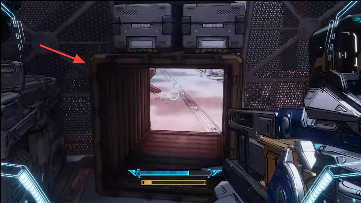 Step 2: Continue forward until you pass through a corridor formed by a large open shipping container. On exiting the container, turn left to the next arena.